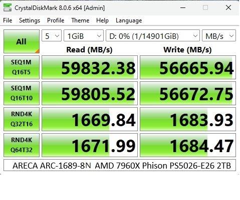 Actual data rates may vary depending on operating environment, RAID mode, RAID configuration, NVMe model and NVMe performance. The best performance is installed the PCIe Gen 5 x4 NVMes and connect the ARC-1689-8N to a computer that supports PCIe Gen 5.0 X16 slot. Below is the test result on the new AMD.