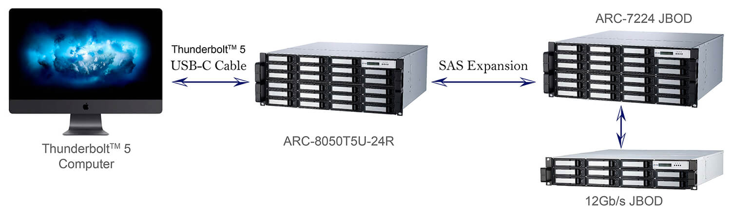 The storage capacity can be expanded instantly by adding additional cost effective ARC-4038 12G SAS Expander units, up to 512 drives with multiple 12G SAS expanders solutions like the 8/12 bay tower 16/24 or high bay rackmount 12G SASJBODs solutions too! Ultimately allow you to convert your 12G SAS expander storage to be use with any Thunderbolt 5 enabled host.